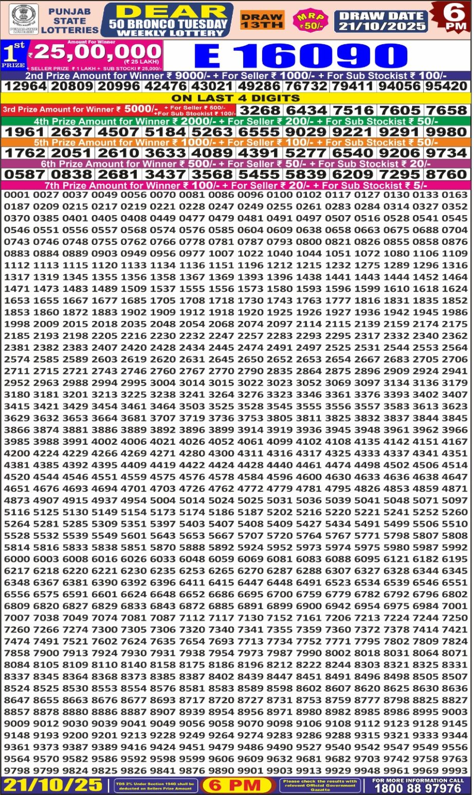 Punjab State Dear 50 Bronco Tuesday Weekly Lottery 6 pm Result 21.10.2025 October 21, 2025 Leave a Comment on Punjab State Dear 50 Bronco Tuesday Weekly Lottery 6 pm Result 21.10.2025 Share: XFacebookPinterestRedditVKDiggLinkedinMix Related Articles 0 51 Dear Godavari Tuesday Weekly Lottery 1 PM Result 12.08.2025 0 13 Rajshree Thursday Weekly Lottery 8 PM Result 06.11.2025 0 75 Rajshree 30 Mangal Weekly Lottery 8:30 PM Result 15.07.2025 0 66 Maharashtra Ganeshlaxmi Weekly Lottery 5 PM Result 22.07.2025