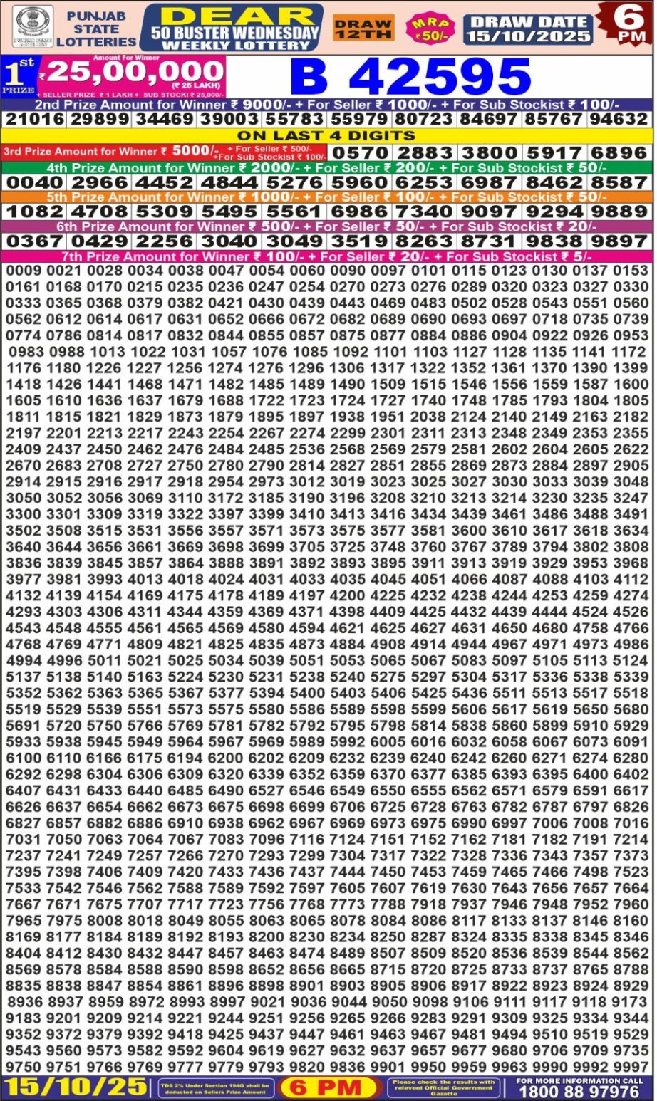 Punjab State Dear 50 Buster Wednesday Weekly Lottery 6 PM Result 15.10.2025 October 15, 2025 Leave a Comment on Punjab State Dear 50 Buster Wednesday Weekly Lottery 6 PM Result 15.10.2025 Share: XFacebookPinterestRedditVKDiggLinkedinMix Related Articles 0 61 Rajshree Marigold Weekly Lottery 4 PM Result 15.09.2025 0 65 Maharashtra Sahyadri Weekly Lottery 4.30 PM Result 03.07.2025 0 70 Rajshree 10 Evening Weekly Lottery 5:40 PM Result 17.06.2025 0 66 Maharashtra Sagar Laxmi Weekly Lottery 4.15 PM Result 15.09.2025