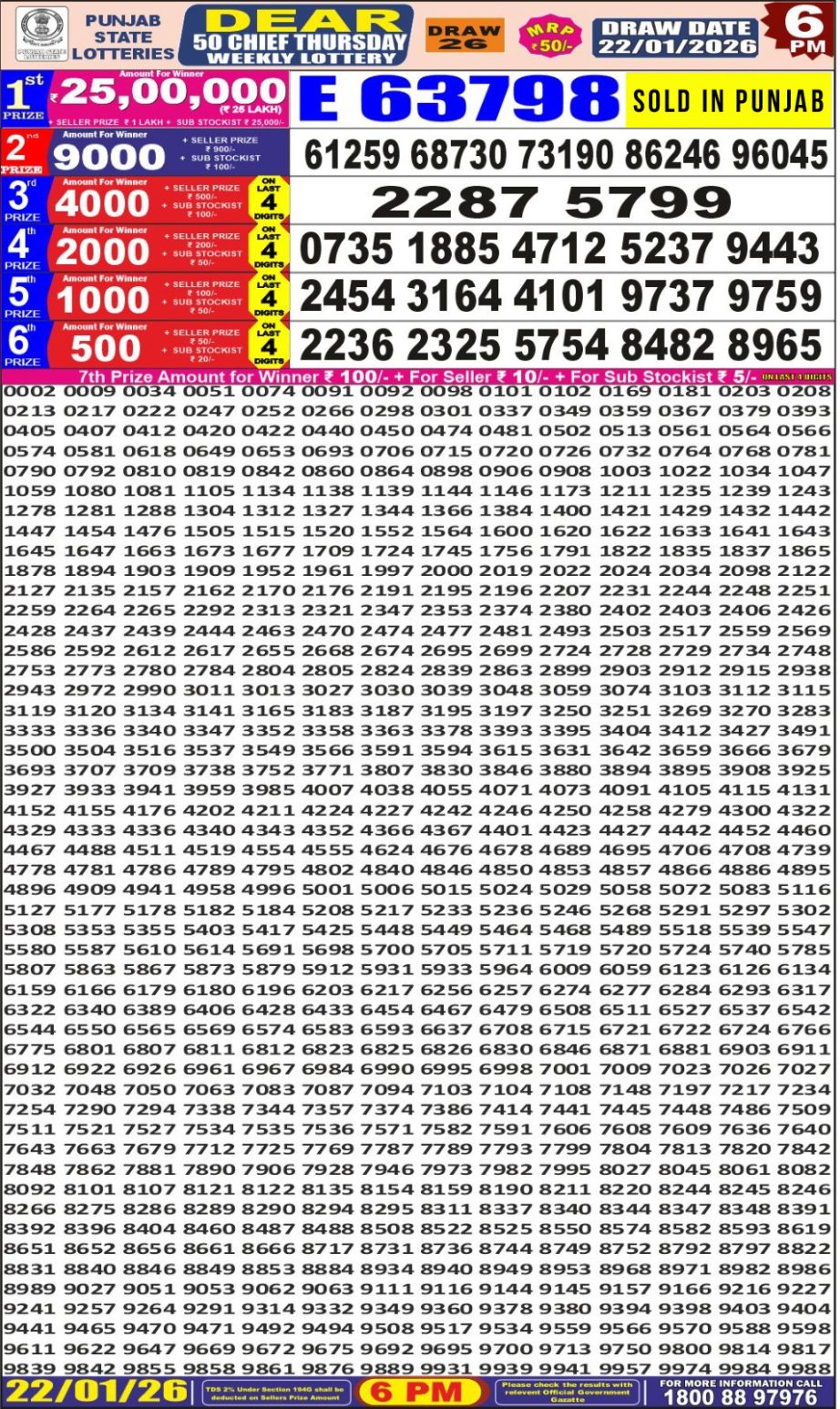 Punjab State Dear 50 Chief Thursday Weekly Lottery 6 PM Result 22.01.2026 January 22, 2026 Leave a Comment on Punjab State Dear 50 Chief Thursday Weekly Lottery 6 PM Result 22.01.2026 Share: XFacebookPinterestRedditVKDiggLinkedinMix Related Articles 0 144 Maharashtra Gajlaxmi Weekly Lottery 4:45 Pm Result 22.05.2025 0 26 Rajshree 10 Evening Weekly Lottery 5:40 PM Result 27.01.2026 0 36 Golden Star Ravi Weekly Lottery 9 PM Result 28.12.2025 0 105 Rajshree 50 Shukra Weekly Lottery 7:30 PM Result 18.07.2025