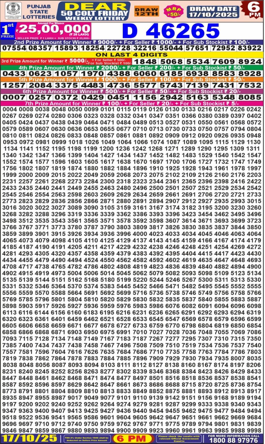 Punjab State Dear 50 colt Friday Weekly Lottery 6 pm Result 17.10.2025 October 17, 2025 Leave a Comment on Punjab State Dear 50 colt Friday Weekly Lottery 6 pm Result 17.10.2025 Share: XFacebookPinterestRedditVKDiggLinkedinMix Related Articles 0 82 Maharashtra Akarshak Weekly Lottery 4.15 PM Result 10.07.2025 0 26 Maharashtra Sagar Laxmi Weekly Lottery 4.15 PM Result 06.10.2025 0 74 Golden Star Guru Weekly Lottery 9 PM Result 07.08.2025 0 19 Punjab State Dear Diwali Bumper Lottery Result 31.10.2025 – Now live