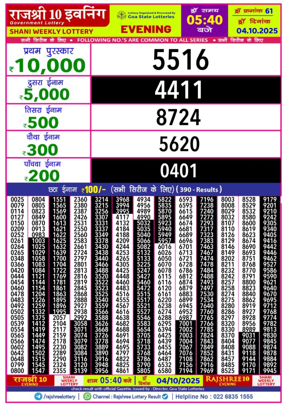 Rajshree 10 Evening Weekly Lottery 5:40 PM Result 04.10.2025 October 4, 2025 Leave a Comment on Rajshree 10 Evening Weekly Lottery 5:40 PM Result 04.10.2025 Share: XFacebookPinterestRedditVKDiggLinkedinMix Related Articles 0 98 Rajshree Thursday Weekly Lottery 8 Pm Result 15.05.2025 0 84 Rajshree 10 Evening Weekly Lottery 5:40 Pm Result 10.5.2025 0 107 Dear 10 Pink Thursday Weekly 1:30 Pm Result 15.05.2025 0 70 Maharashtra Mohini Weekly Lottery 4.30 PM Result 14.09.2025