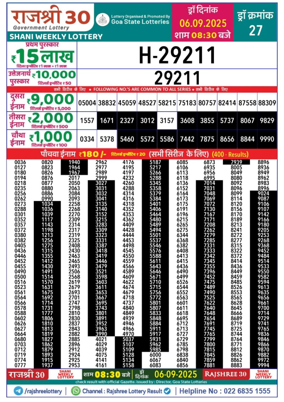 Rajshree 30 Shani Weekly Lottery 8:30 PM 06.09.2025 September 6, 2025 Leave a Comment on Rajshree 30 Shani Weekly Lottery 8:30 PM 06.09.2025 Share: XFacebookPinterestRedditVKDiggLinkedinMix Related Articles 0 73 Dear Seagull Friday Weekly Lottery 8 PM Result 20.06.2025 0 63 Golden Star Shukra Weekly Lottery 9 PM Result 18.07.2025 0 68 Rajshree Sunday Weekly Lottery 8 PM Result 13.07.2025 0 69 Dear Goose Tuesday Weekly Lottery 8 PM Result 17.06.2025