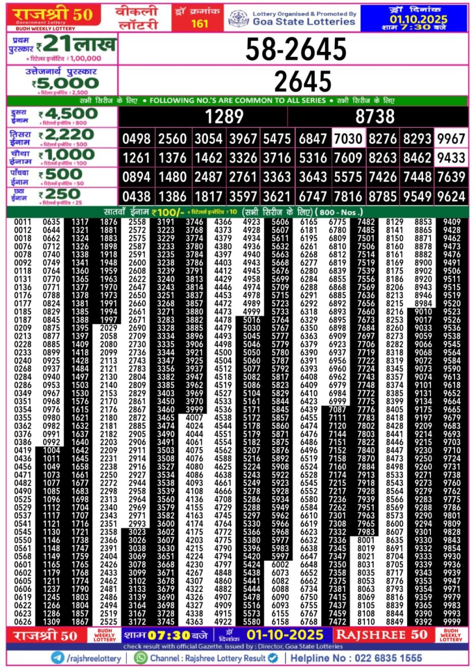 Rajshree 50 Budh Weekly Lottery 7:30 PM Result 01.10.2025 October 1, 2025 Leave a Comment on Rajshree 50 Budh Weekly Lottery 7:30 PM Result 01.10.2025 Share: XFacebookPinterestRedditVKDiggLinkedinMix Related Articles 0 78 Dear Godavari Tuesday Weekly Lottery 1 PM Result 03.06.2025 0 133 Golden 200 Monthly Lottery Result 18.06.2025 0 56 Maharashtra Ganeshlaxmi Weekly Lottery 5 PM Result 11.08.2025 0 34 Punjab State Dear 50 Ranger Sunday Weekly Lottery 6 pm Result 05.10.2025