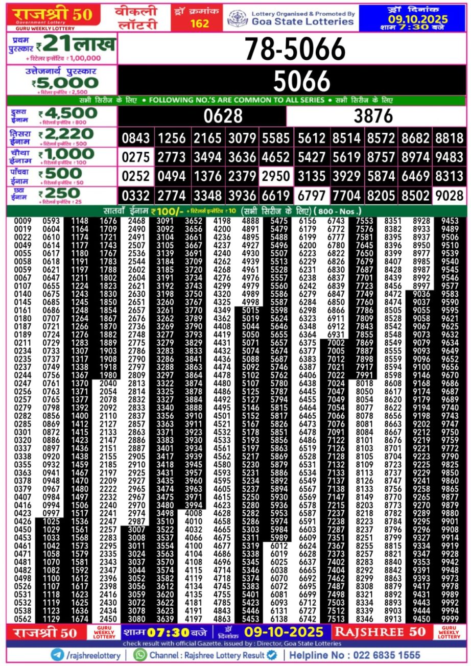 Rajshree 50 Guru Weekly Lottery 7:30 PM Result 09.10.2025 October 9, 2025 Leave a Comment on Rajshree 50 Guru Weekly Lottery 7:30 PM Result 09.10.2025 Share: XFacebookPinterestRedditVKDiggLinkedinMix Related Articles 0 125 Maharashtra Gajlaxmi Weekly Lottery 4:45 PM Result 05.05.25 0 43 Rajshree 50 Ravi Weekly Lottery 7:30 PM Result 28.09.2025 0 186 Dear Mahanadi Thursday Weekly Lottery 1 Pm Result 12.06.2025 0 67 Dear Super Silver Friday Weekly Lottery 7 PM Result 18.07.2025