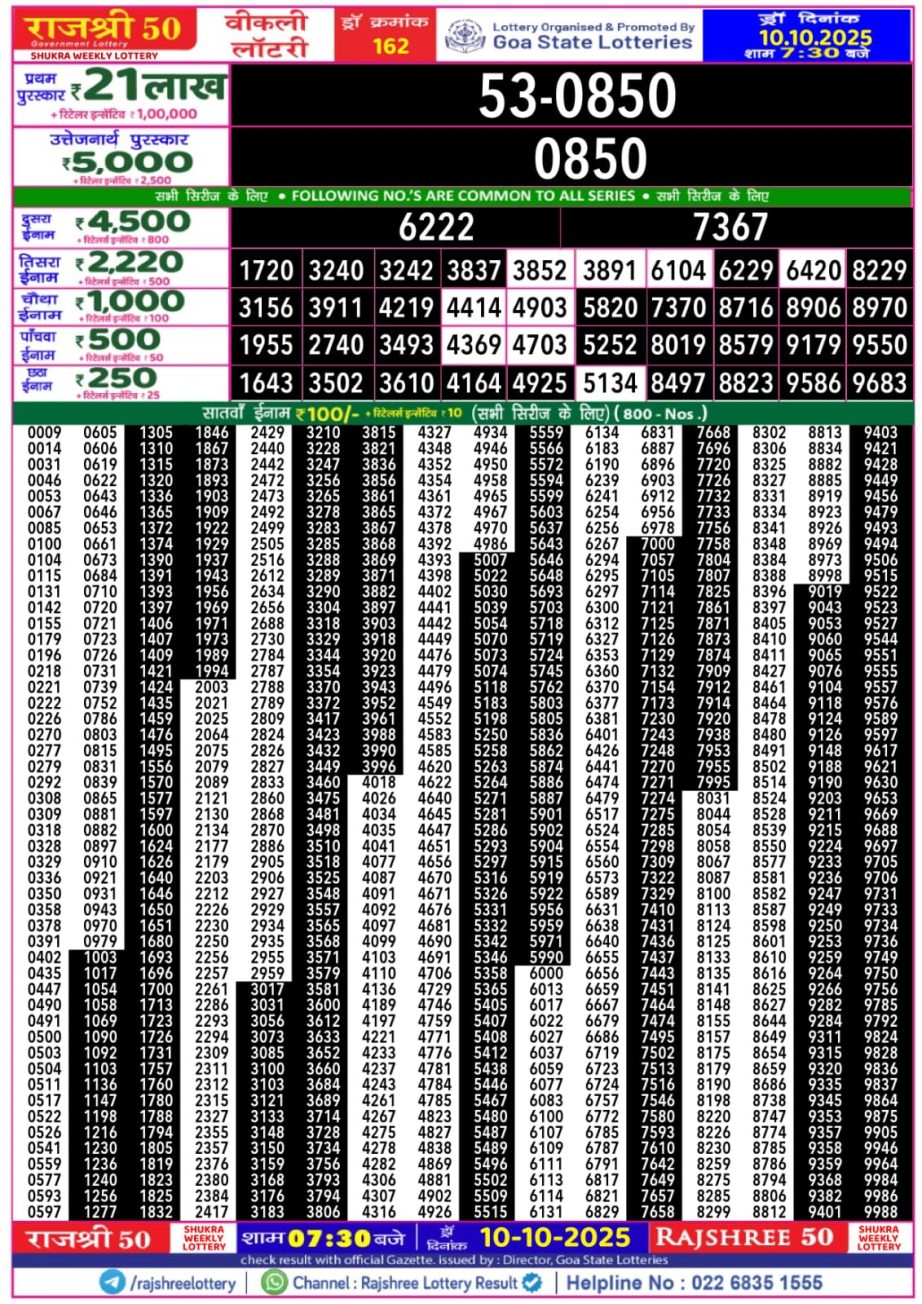 Rajshree 50 Shukra Weekly Lottery 7:30 PM Result 10.10.2025 October 10, 2025 Leave a Comment on Rajshree 50 Shukra Weekly Lottery 7:30 PM Result 10.10.2025 Share: XFacebookPinterestRedditVKDiggLinkedinMix Related Articles 0 56 Maharashtra Gajlaxmi Weekly Lottery 4.45 PM Result 31.07.2025 0 44 Dear Indus Wednesday Weekly Lottery 1 PM Result 01.10.2025 0 72 Rajshree 30 Guru Weekly Lottery 8:30 Pm Result 05.06.2025 0 75 Dear 100 Gomti Saturday Weekly Lottery 5 Pm Result 14.06.2025