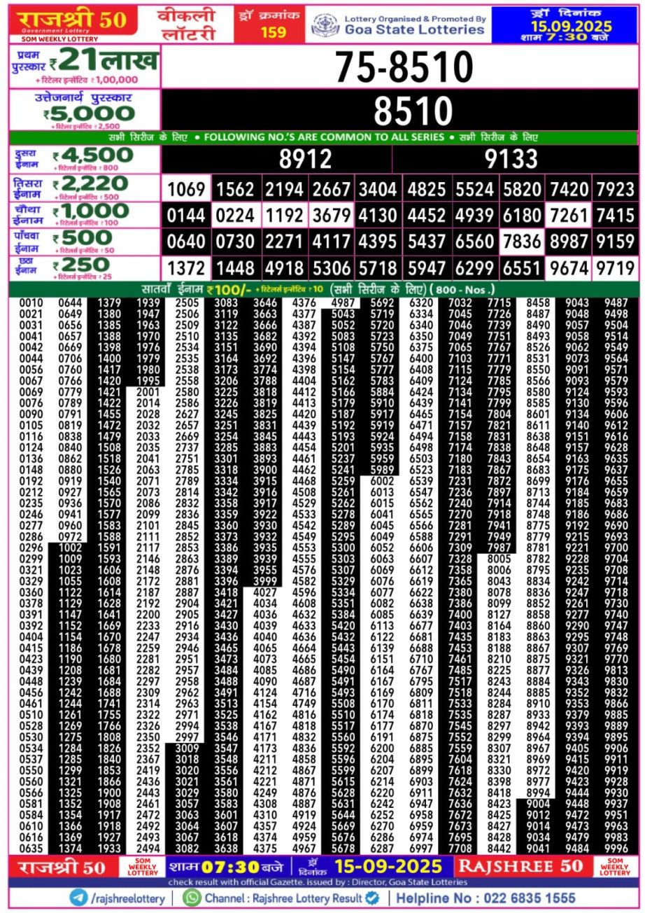 Rajshree 50 Som Weekly Lottery 7:30 PM Result 15.09.2025 September 15, 2025 Leave a Comment on Rajshree 50 Som Weekly Lottery 7:30 PM Result 15.09.2025 Share: XFacebookPinterestRedditVKDiggLinkedinMix Related Articles 0 57 Rajshree Lily Weekly Lottery 4 PM Result 30.07.2025 0 19 Rajshree 50 Shukra Weekly Lottery 7:30 PM Result 31.10.2025 0 234 Maharashtra Vaibhav Laxmi Weekly Lottery 4:15 Pm Result 23.05.2025 0 49 Labh Laxmi Joy Saturday Weekly Lottery 4 PM Result 16.08.2025