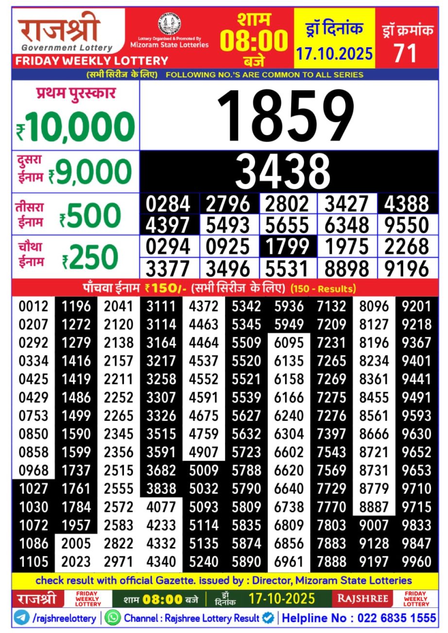 Rajshree Friday Weekly Lottery 8 PM Result 17.10.2025 October 17, 2025 Leave a Comment on Rajshree Friday Weekly Lottery 8 PM Result 17.10.2025 Share: XFacebookPinterestRedditVKDiggLinkedinMix Related Articles 0 94 Maharashtra Ganeshlaxmi Weekly Lottery 5 PM Result 11.09.2025 0 55 Rajshree 10 Evening Weekly Lottery 5:40 PM Result 25.07.2025 0 106 Dear Dwarka Monday Weekly Lottery 1 PM Result 12.05.2025 0 91 Dear Dwarka Monday Weekly Lottery 1 Pm Result 09.06.2025