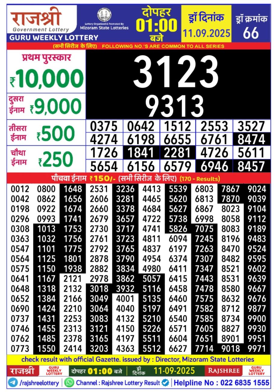 Rajshree Guru Weekly Lottery 1 PM Result 11.09.2025 September 11, 2025 Leave a Comment on Rajshree Guru Weekly Lottery 1 PM Result 11.09.2025 Share: XFacebookPinterestRedditVKDiggLinkedinMix Related Articles 0 63 Rajshree Orchid Weekly Lottery 4 PM Result 05.07.2025 0 79 Rajshree 30 Shani Weekly Lottery 8:30 Pm Result 24.05.2025 0 81 Rajshree Som Weekly Lottery 8 PM Result 08.09.2025 0 75 Maharashtra Akarshak Weekly Lottery 4:15 PM Result 19.06.2025