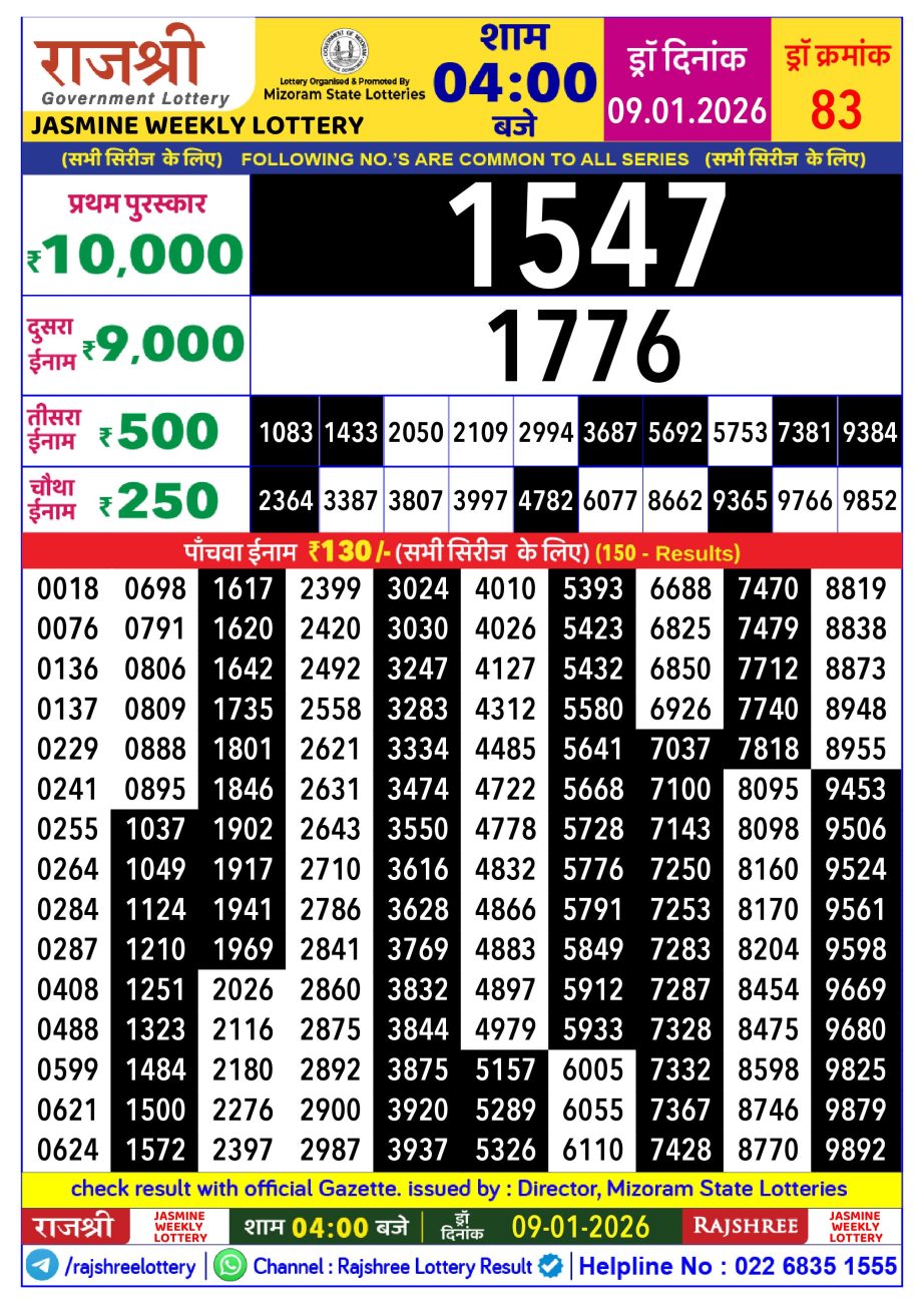 Rajshree Jasmine Weekly Lottery 4 PM Result 09.01.2026 January 9, 2026 Leave a Comment on Rajshree Jasmine Weekly Lottery 4 PM Result 09.01.2026 Share: XFacebookPinterestRedditVKDiggLinkedinMix Related Articles 0 91 Dear Supreme Thursday Weekly Lottery 6 PM Result 23.10.2025 0 116 Dear Super Mercury Sunday Weekly Lottery 7 PM Result 22.06.2025 0 90 Rajshree Budh Weekly Lottery 1 PM Result 02.07.2025 0 59 Maharashtra Ganeshlaxmi Weekly Lottery 5 PM Result 20.09.2025