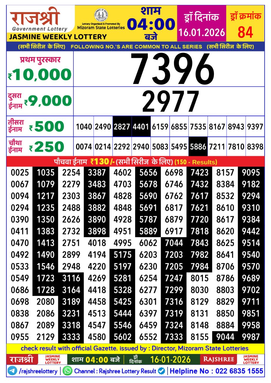 Rajshree Jasmine Weekly Lottery 4 PM Result 16.01.2026 January 16, 2026 Leave a Comment on Rajshree Jasmine Weekly Lottery 4 PM Result 16.01.2026 Share: XFacebookPinterestRedditVKDiggLinkedinMix Related Articles 0 140 Dear Donner Saturday Weekly Lottery 6 Pm Result 10.5.2025 0 96 Dear Sandpiper Thursday Weekly Lottery 8 PM Result 23.10.2025 0 87 Rajshree 30 Som Weekly Lottery 8:30 PM Result 21.07.2025 0 17 Dear Prestige Tuesday Weekly Lottery 6 PM Result 06.01.2026