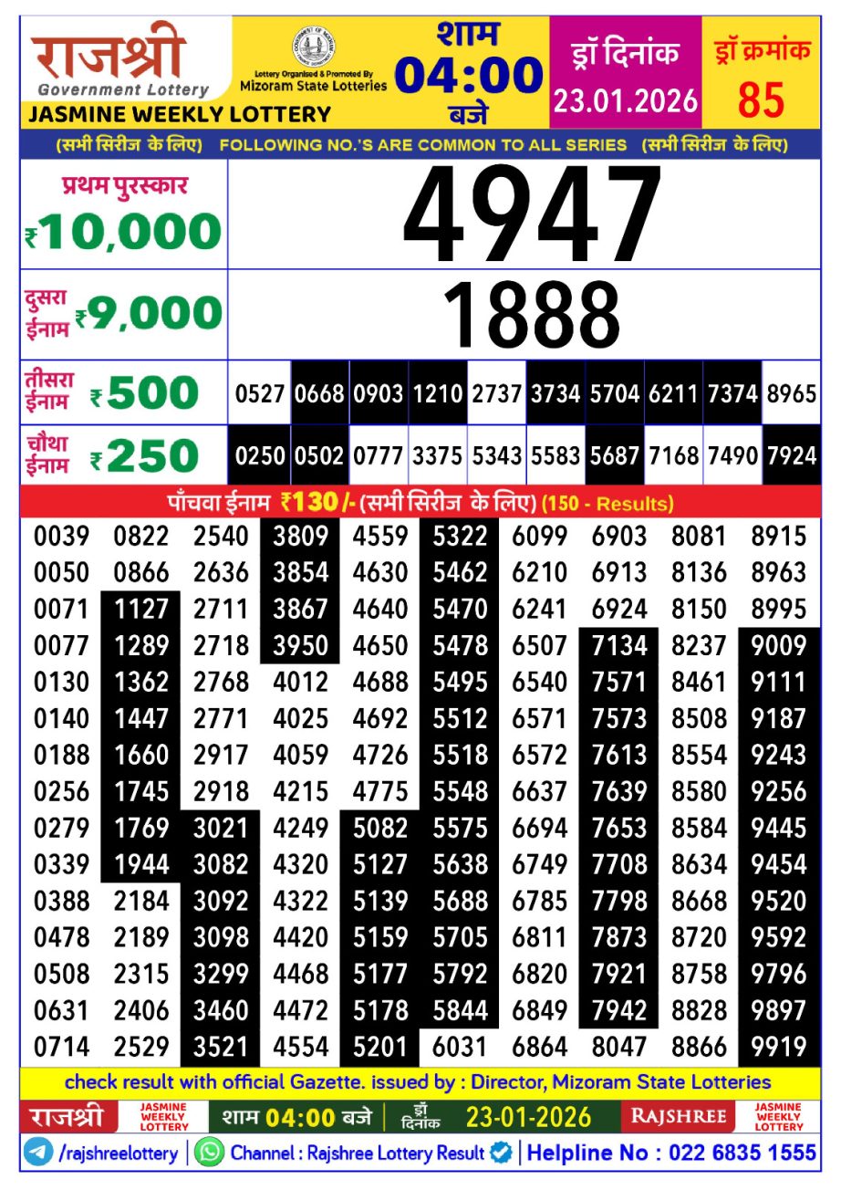 Rajshree Jasmine Weekly Lottery 4 PM Result 23.01.2026 January 23, 2026 Leave a Comment on Rajshree Jasmine Weekly Lottery 4 PM Result 23.01.2026 Share: XFacebookPinterestRedditVKDiggLinkedinMix Related Articles 0 37 Rajshree Som Weekly Lottery 1 PM Result 22.12.2025 0 208 Dear Dwarka Monday Weekly Lottery 1 PM Result 12.05.2025 0 125 Punjab State Dear 50 Monthly Lottery Result 17.06.2025 0 136 Maharashtra Mohini Weekly Lottery 4:30 PM Result 27.04.25