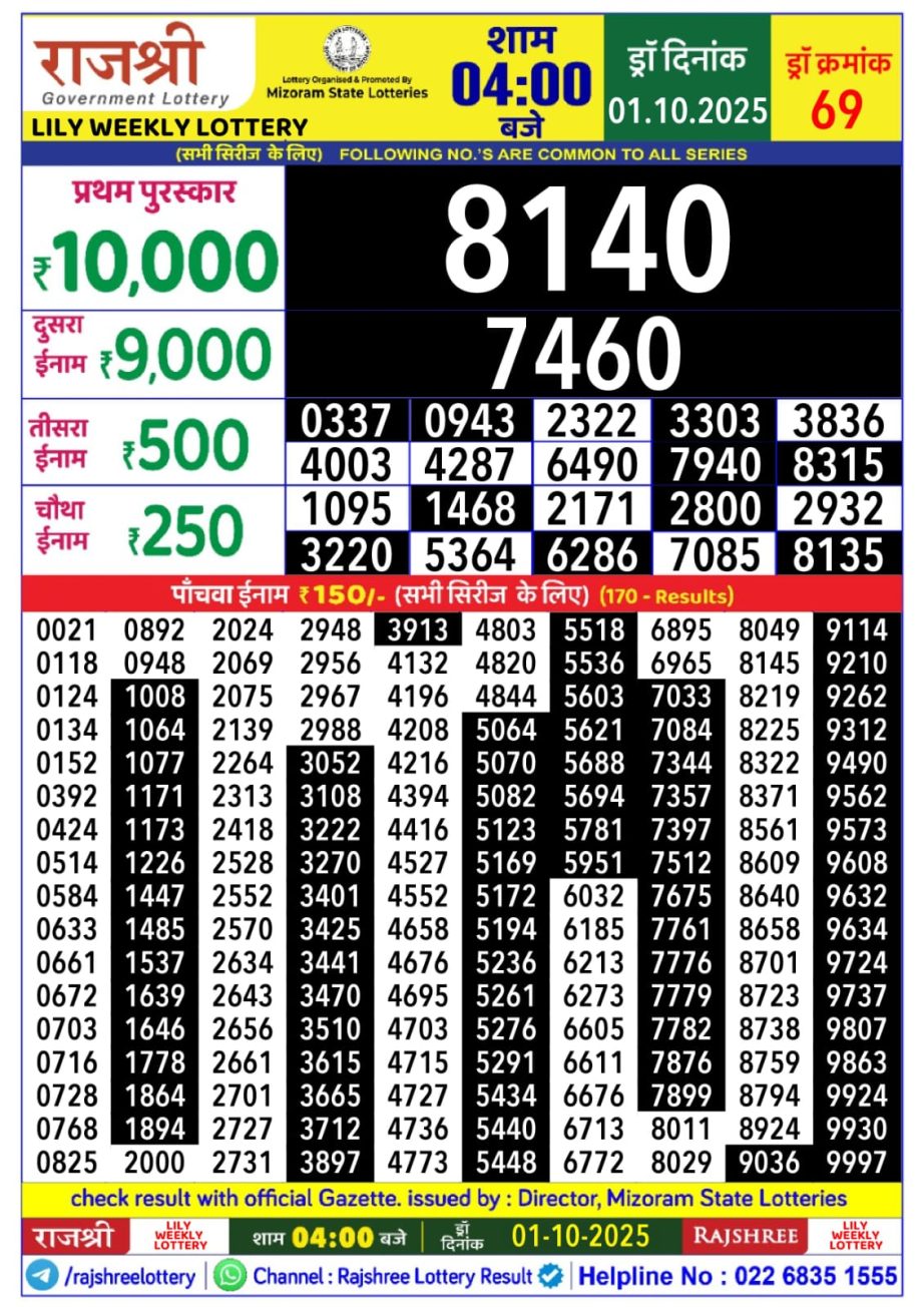 Rajshree Lily Weekly Lottery 4 PM Result 01.10.2025