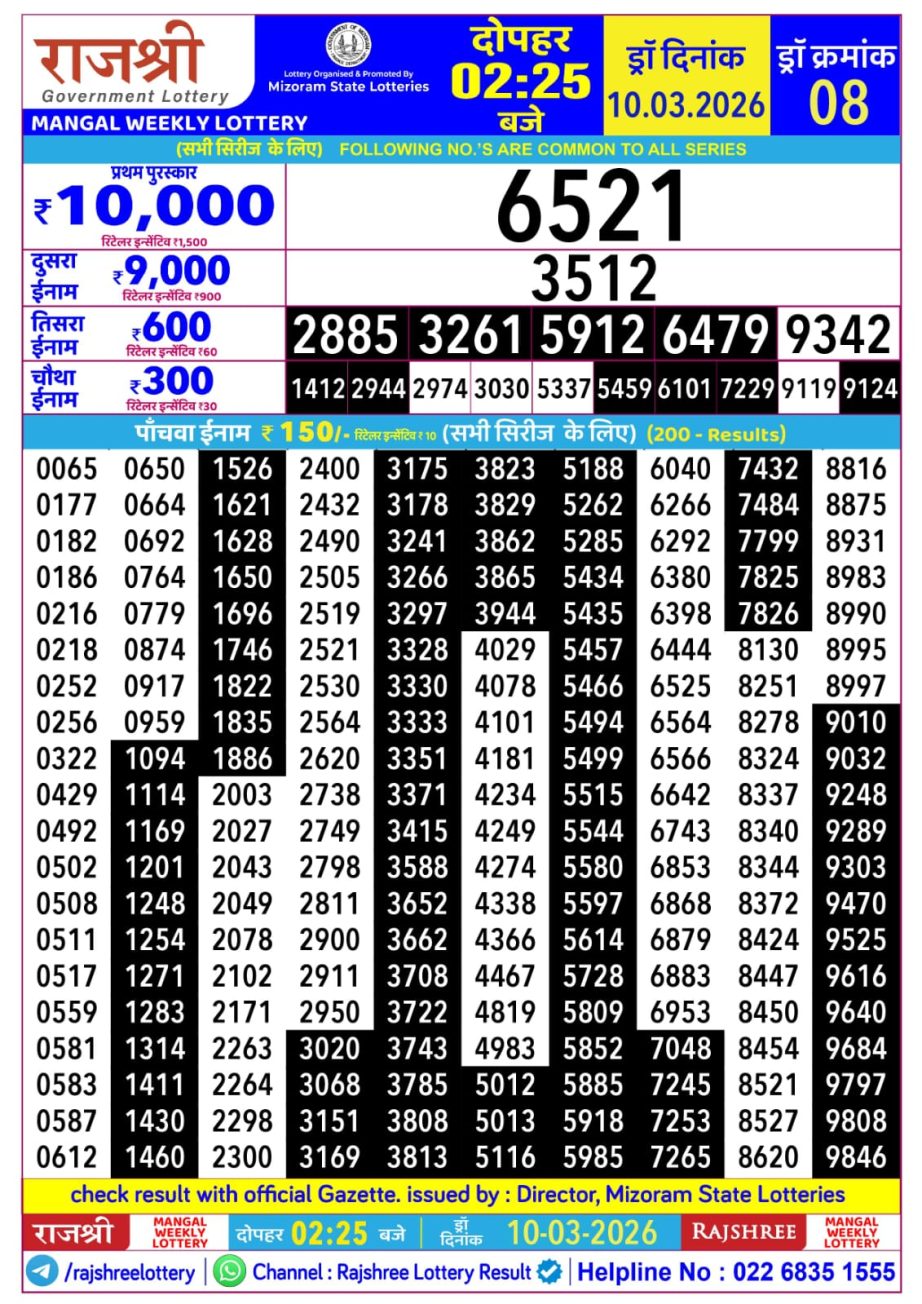 Rajshree Mangal Weekly Lottery 2.25PM Result 10.03.2026 10 03 2026 Leave a Comment on Rajshree Mangal Weekly Lottery 2.25PM Result 10.03.2026 Share: XFacebookPinterestRedditVKDiggLinkedinMix Related Articles 0 41 Maharashtra Sahyadri Weekly Lottery Result 02.03.2026 0 50 Rajshree 10 Evening Weekly Lottery 5:40 PM Result 18.02.2026 0 51 Rajshree Thursday Weekly Lottery 8 PM Result 29.01.2026 0 24 Maharashtra Maharashtra Laxmi Weekly Lottery Draw Result 14.03.2026
