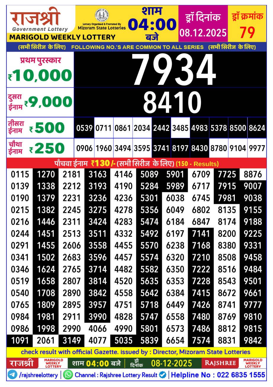 Rajshree Marigold Weekly Lottery 4 PM Result 08.12.2025 December 8, 2025 Leave a Comment on Rajshree Marigold Weekly Lottery 4 PM Result 08.12.2025 Share: XFacebookPinterestRedditVKDiggLinkedinMix Related Articles 0 141 Rajshree Mangal Weekly Lottery 1:00 PM Result 29.04.2025 0 95 Maharashtra Gajlaxmi Weekly Lottery 4:45 Pm Result 07.06.2025 0 129 Rajshree 10 Evening Weekly Lottery 5:40 Pm Result 11.5.2025 0 37 Rajshree 10 Evening Weekly Lottery 5:40 PM Result 10.11.2025