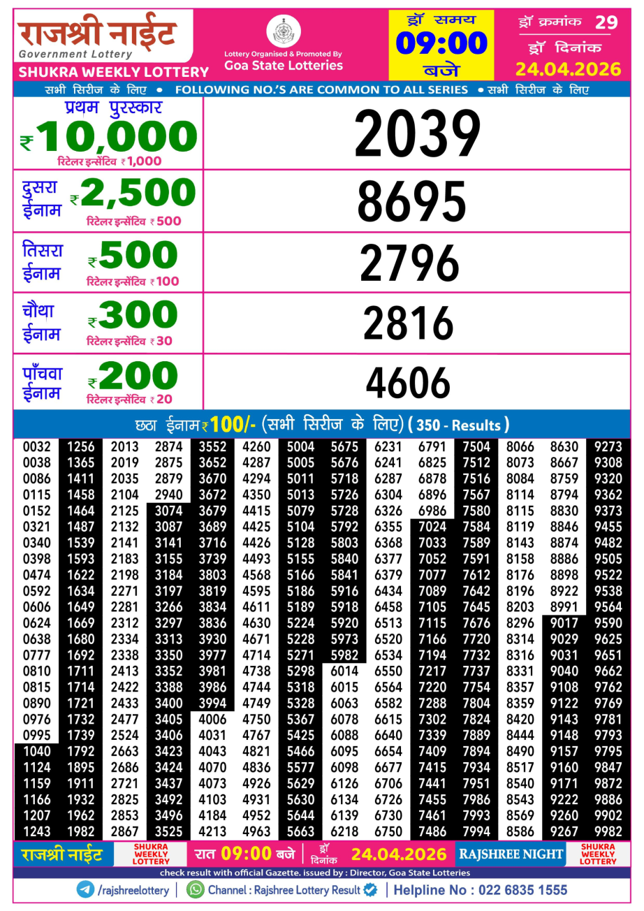 Rajshree Night 9pm Lottery Result 24.04.2026 24 04 2026 Leave a Comment on Rajshree Night 9pm Lottery Result 24.04.2026 Share: XFacebookPinterestRedditVKDiggLinkedinMix Related Articles 0 100 Rajshree Guru Weekly Lottery 1 PM Result 04.12.2025 0 87 Maharashtra Sahyadri monthly lottery result 13.01.2026 0 16 Dear Dream Wednessday Weekly Lottery 8 PM Result 22.04.2026 0 13 Maharashtra Ganeshlaxmi Weekly Lottery Result 23.04.2026