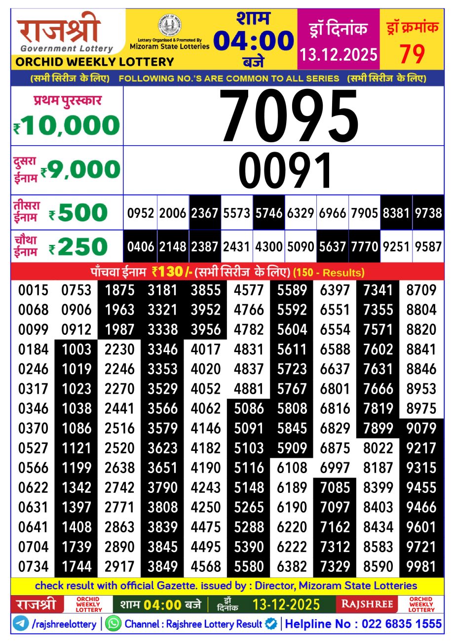 Rajshree orchid Weekly Lottery 4 PM Result 13.12.2025 December 13, 2025 Leave a Comment on Rajshree orchid Weekly Lottery 4 PM Result 13.12.2025 Share: XFacebookPinterestRedditVKDiggLinkedinMix Related Articles 0 125 Rajshree Lily Weekly Lottery 4 Pm Result 7.5.2025 0 82 Dear 10 Orange Wednesday Weekly Lottery 1.30 PM Result 09.07.2025 0 74 Maharashtra Gajlaxmi Weekly Lottery 4.45 PM Result 24.07.2025 0 84 Dear Super Gold Monday Weekly Lottery 7 PM Result 14.07.2025