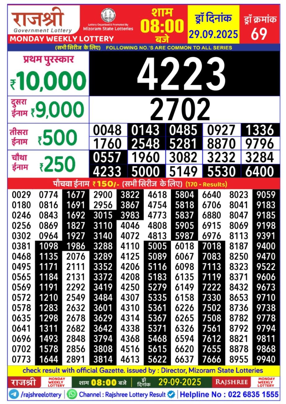 Rajshree Som Weekly Lottery 8 PM Result 29.09.2025 September 29, 2025 Leave a Comment on Rajshree Som Weekly Lottery 8 PM Result 29.09.2025 Share: XFacebookPinterestRedditVKDiggLinkedinMix Related Articles 0 34 Maharashtra Gajlaxmi Weekly Lottery 4.45 PM Result 06.10.2025 0 78 Labh Laxmi Delight Wednesday Weekly Lottery 4 Pm Result 14.05.2025 0 27 Labh Laxmi Power Sunday Weekly Lottery 4 PM Result 12.10.2025 0 37 Rajshree Ravi Weekly Lottery 1 PM Result 21.09.2025