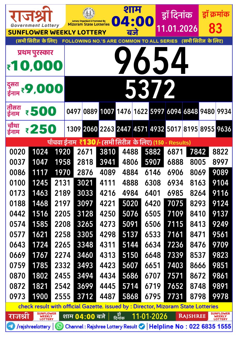 Rajshree Sunflower Weekly Lottery 4 PM Result 11.01.2026 January 11, 2026 Leave a Comment on Rajshree Sunflower Weekly Lottery 4 PM Result 11.01.2026 Share: XFacebookPinterestRedditVKDiggLinkedinMix Related Articles 0 68 Rajshree Weekly Lottery 9 PM Result 08.10.2025 0 76 Rajshree 10 Evening Weekly Lottery 5:40 PM Result 05.08.2025 0 63 Rajshree 10 Evening Weekly Lottery 5:40 PM Result 04.11.2025 0 22 Rajshree Guru Weekly Lottery 1 PM Result 11.12.2025
