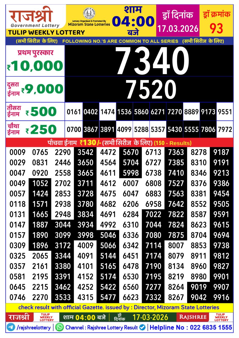 Rajshree Tulip Weekly Lottery 4 PM Result 17.03.2026 17 03 2026 Leave a Comment on Rajshree Tulip Weekly Lottery 4 PM Result 17.03.2026 Share: XFacebookPinterestRedditVKDiggLinkedinMix Related Articles 0 75 Maharashtra Gajlaxmi Lottery Result 28.12.2025 0 69 Maharashtra Gajlaxmi Lottery Result 14.01.2026 0 76 Dear Prestige Tuesday Weekly Lottery 6 PM Result 09.12.2025 0 34 Punjab State Dear 50 Buster Wednessday Weekly Lottery 5 PM Result 18.03.2026