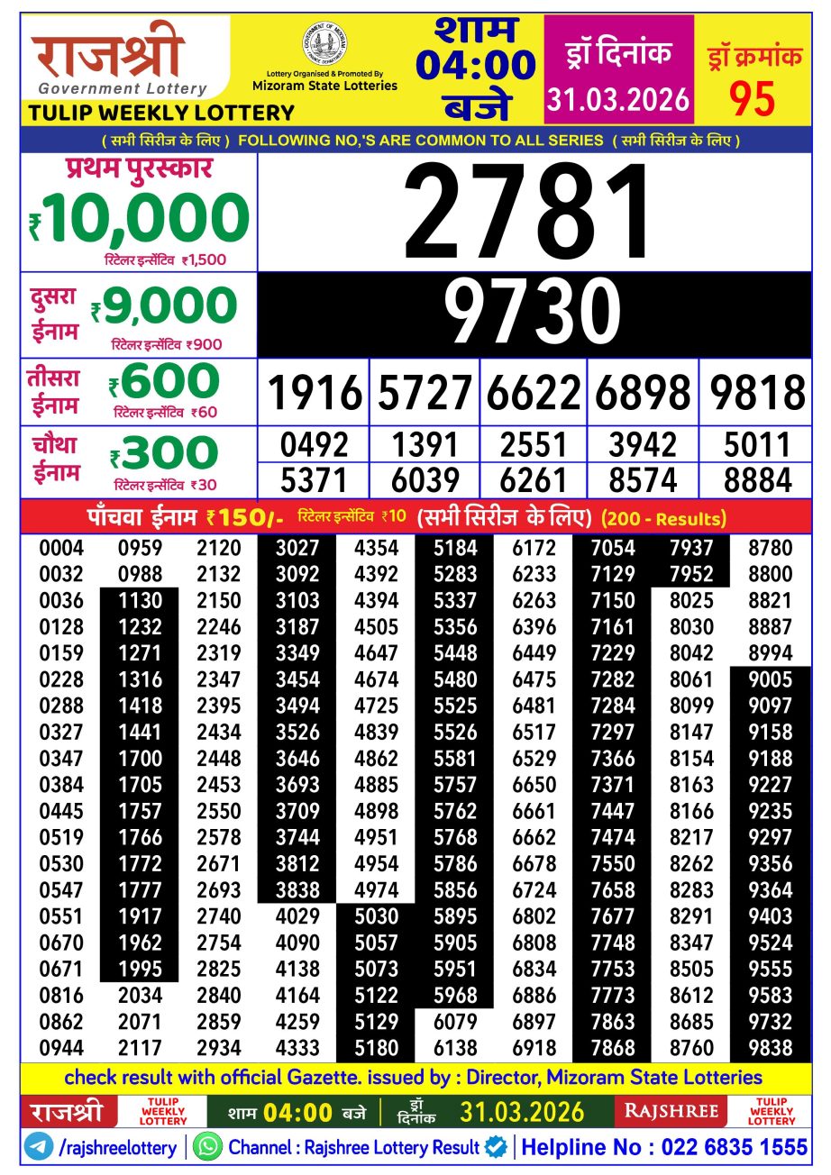 Rajshree Tulip Weekly Lottery 4 PM Result 31.03.2026 31 03 2026 Leave a Comment on Rajshree Tulip Weekly Lottery 4 PM Result 31.03.2026 Share: XFacebookPinterestRedditVKDiggLinkedinMix Related Articles 0 80 Rajshree 50 Shani Weekly Lottery 7:30 PM Result 13.12.2025 0 63 Dear Victory Friday Weekly Lottery 1 PM Result 16.01.2026 0 35 Rajshree Sunday Weekly Lottery 8 PM Result 08.03.2026 0 77 Maharashtra Gajlaxmi Lottery Result 04.12.2025