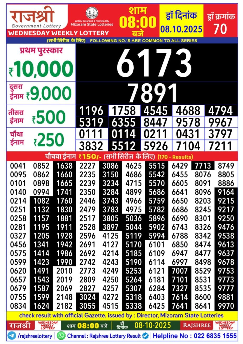 Rajshree Wednesday Weekly Lottery 8 PM Result 08.10.2025 October 8, 2025 Leave a Comment on Rajshree Wednesday Weekly Lottery 8 PM Result 08.10.2025 Share: XFacebookPinterestRedditVKDiggLinkedinMix Related Articles 0 63 Labh Laxmi Power Sunday Weekly Lottery 4 PM Result 13.07.2025 0 55 Dear 10 Maple Monday Weekly Lottery 7 PM Result 15.09.2025 0 22 Golden Star Guru Weekly Lottery 9 PM Result 30.10.2025 0 95 Rajshree 30 Budh Weekly Lottery 8:30 PM Result 25.06.2025