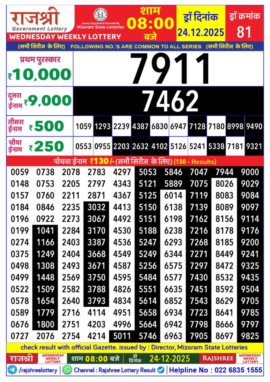 December 24, 2025  Leave a Comment on Rajshree Wednesday  Weekly Lottery 8 PM Result 24.12.2025