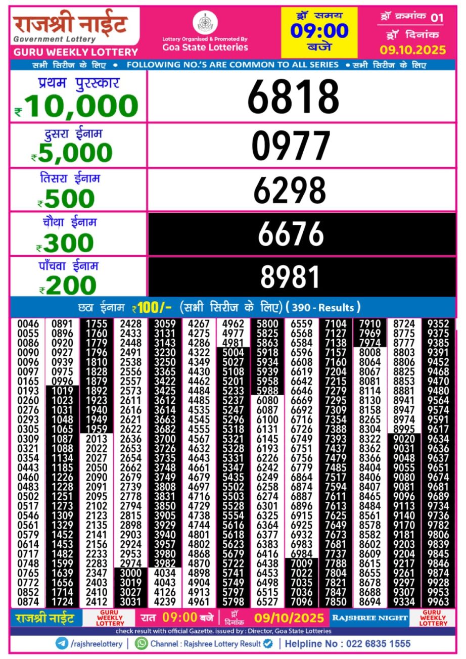 Rajshree Weekly Lottery 9 PM Result 09.10.2025 October 9, 2025 Leave a Comment on Rajshree Weekly Lottery 9 PM Result 09.10.2025 Share: XFacebookPinterestRedditVKDiggLinkedinMix Related Articles 0 21 Golden Star Mangal Weekly Lottery 9 PM Result 04.11.2025 0 74 Rajshree Monday Weekly Lottery 8 PM Result 07.07.2025 0 96 Dear Super Mercury Sunday Weekly Lottery 7 Pm Result 18.05.2025 0 30 Rajshree Weekly Lottery 9 PM Result 13.10.2025